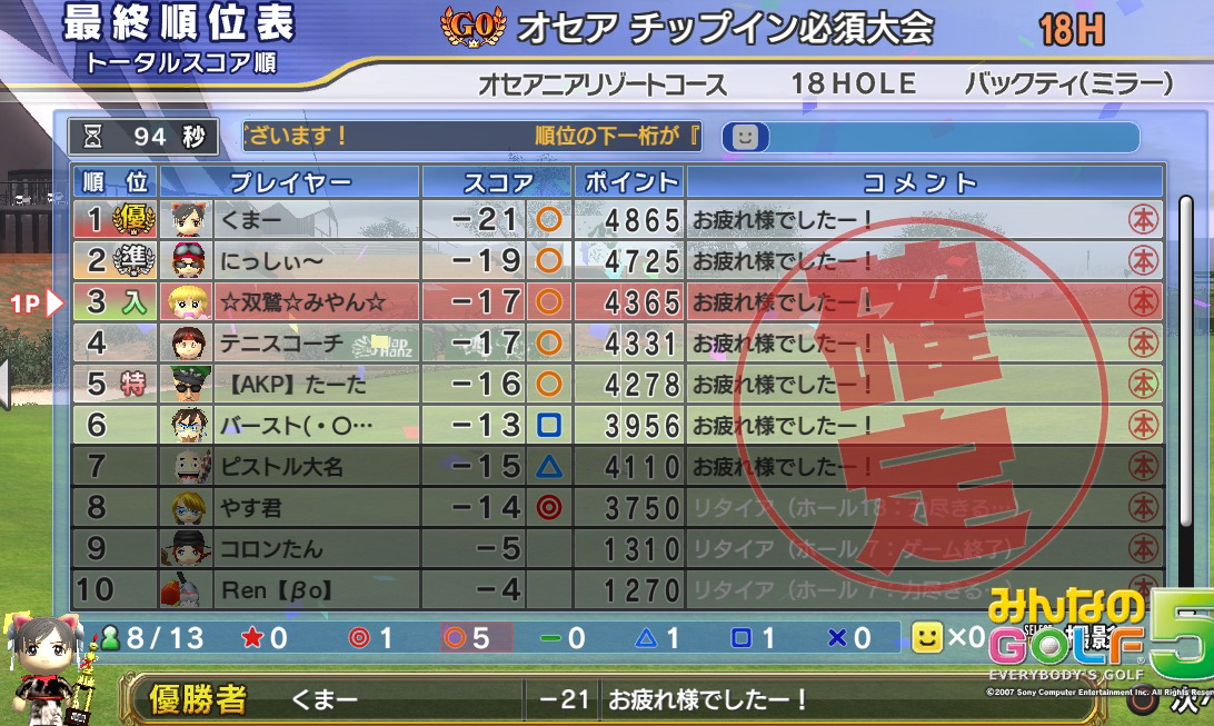 12月3日のオセア18H、バックティー、チップ必須、ユキノ限定。うさ・かめ苦手なので、マグ・インで。苦手なINが意外と安定し、ポイント差でなんとか逃げ切り入賞。途中まで上位7名まで全員Mrで、無理感がハンパなかったですが、諦めずに頑張った甲斐ありました(;´Д`)ハアハア