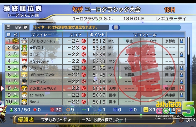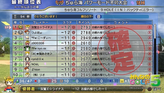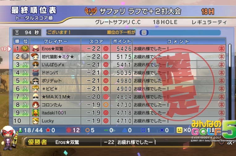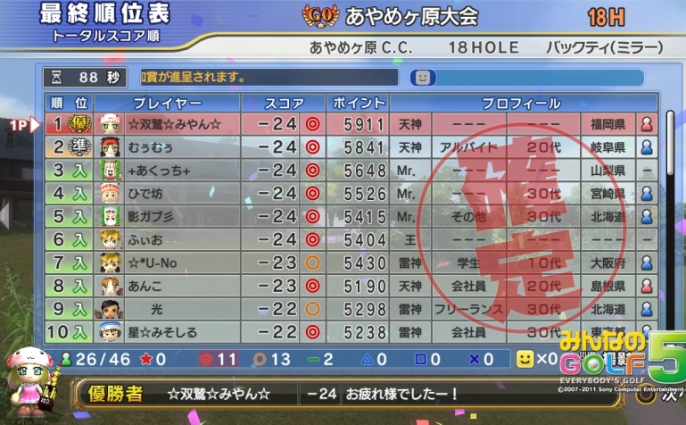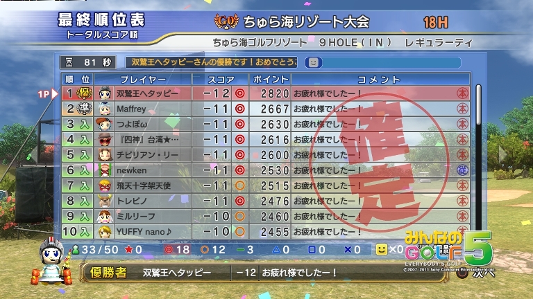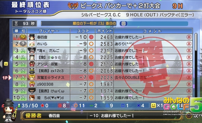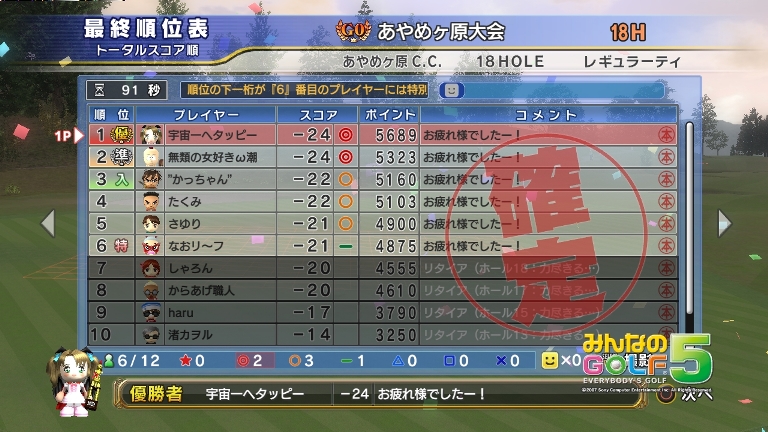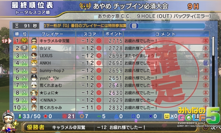 みやんがG0「あやめBOUT・9H、ラフ+2」大会で優勝しましたV