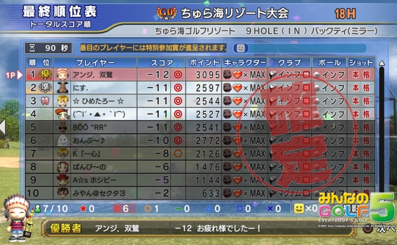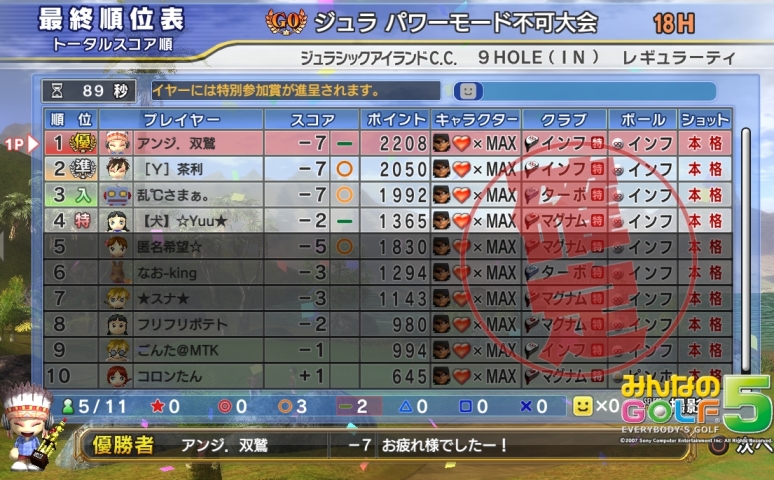 アンジがG0で優勝しました(*^^)v 相変わらず強い! オセアR・9H・OUT、パワーモード不可。P不可は手ごわいっす(';') おめでとう!