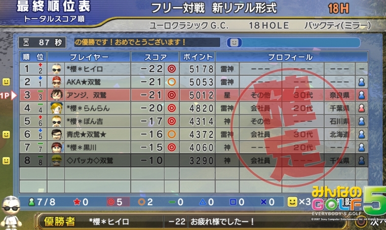 1位5P、2位3P、ミラクル各1P というポイント制でした。